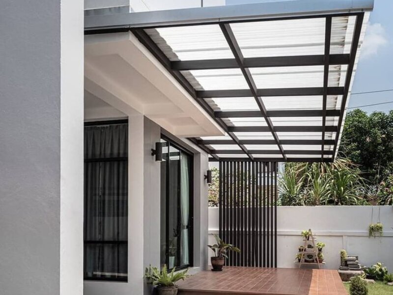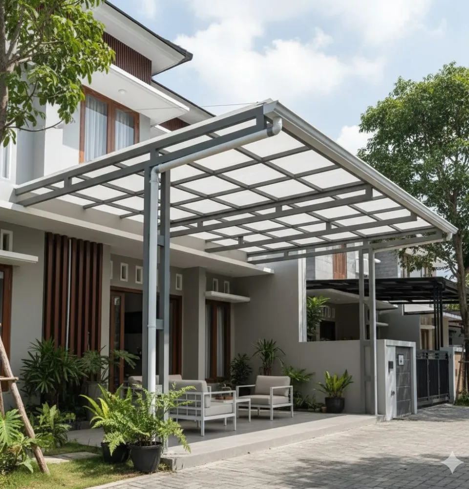 Model ini sangat populer karena tampilannya ringan dan modern. Kanopi polikarbonat memungkinkan cahaya alami tetap masuk sehingga area teras tidak terasa gelap. Biasanya dipadukan dengan rangka besi atau aluminium berwarna hitam atau abu-abu. Cocok untuk rumah minimalis yang ingin tetap terang dan bersih secara visual.