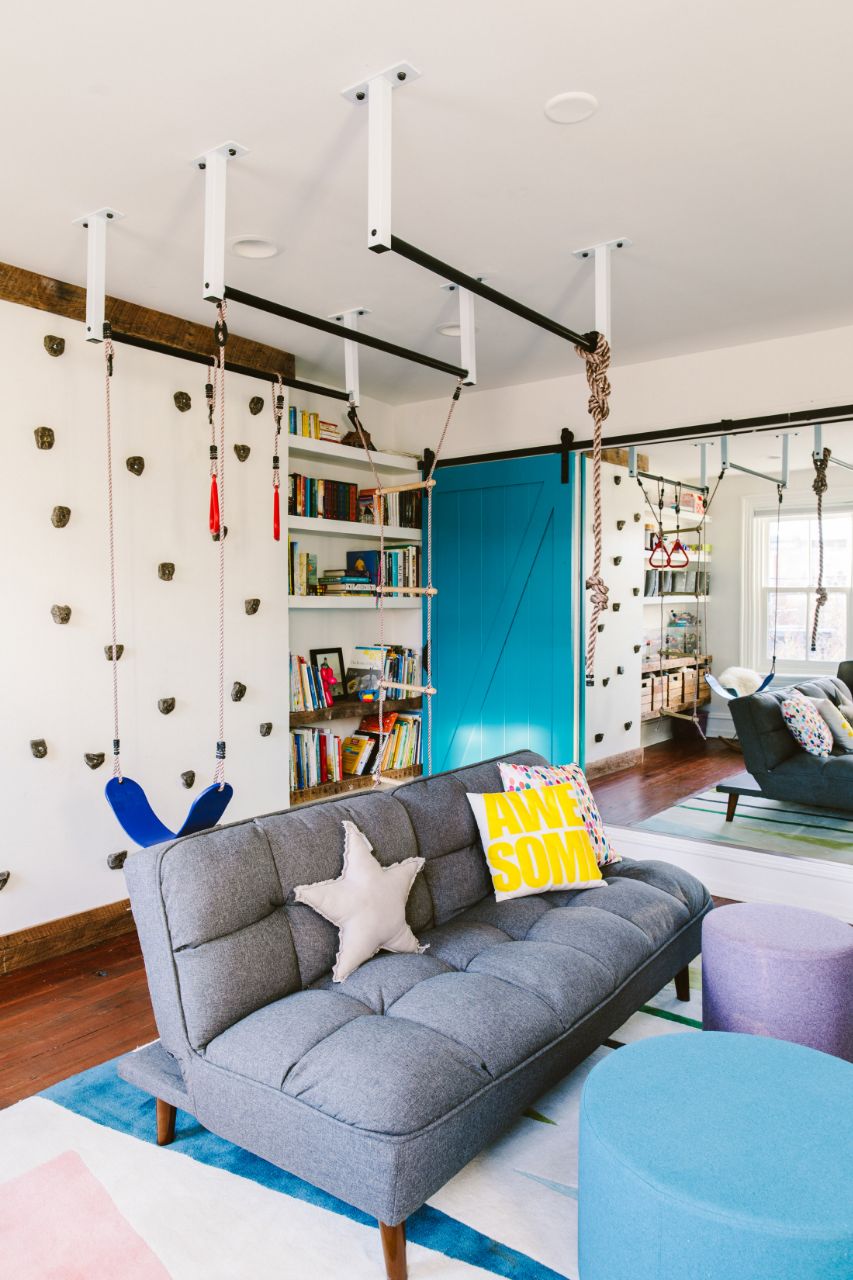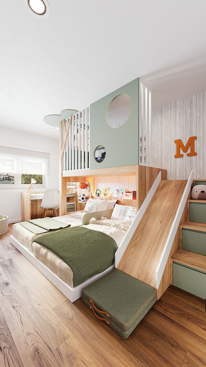 Untuk rumah dengan ruang terbatas, pemanfaatan dinding menjadi solusi efektif. Rak mainan, papan aktivitas, atau area panjat mini dapat dipasang secara vertikal tanpa mengurangi area lantai. Menyatukan tempat tidur dan tempat bermain juga bisa menjadi solusi.