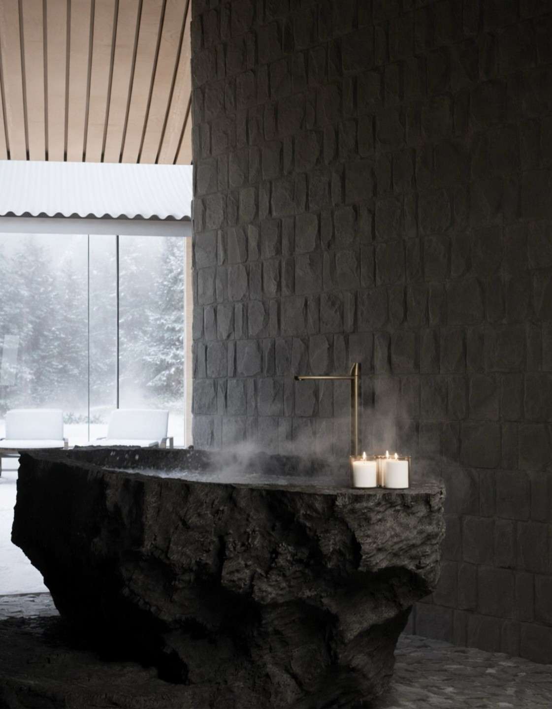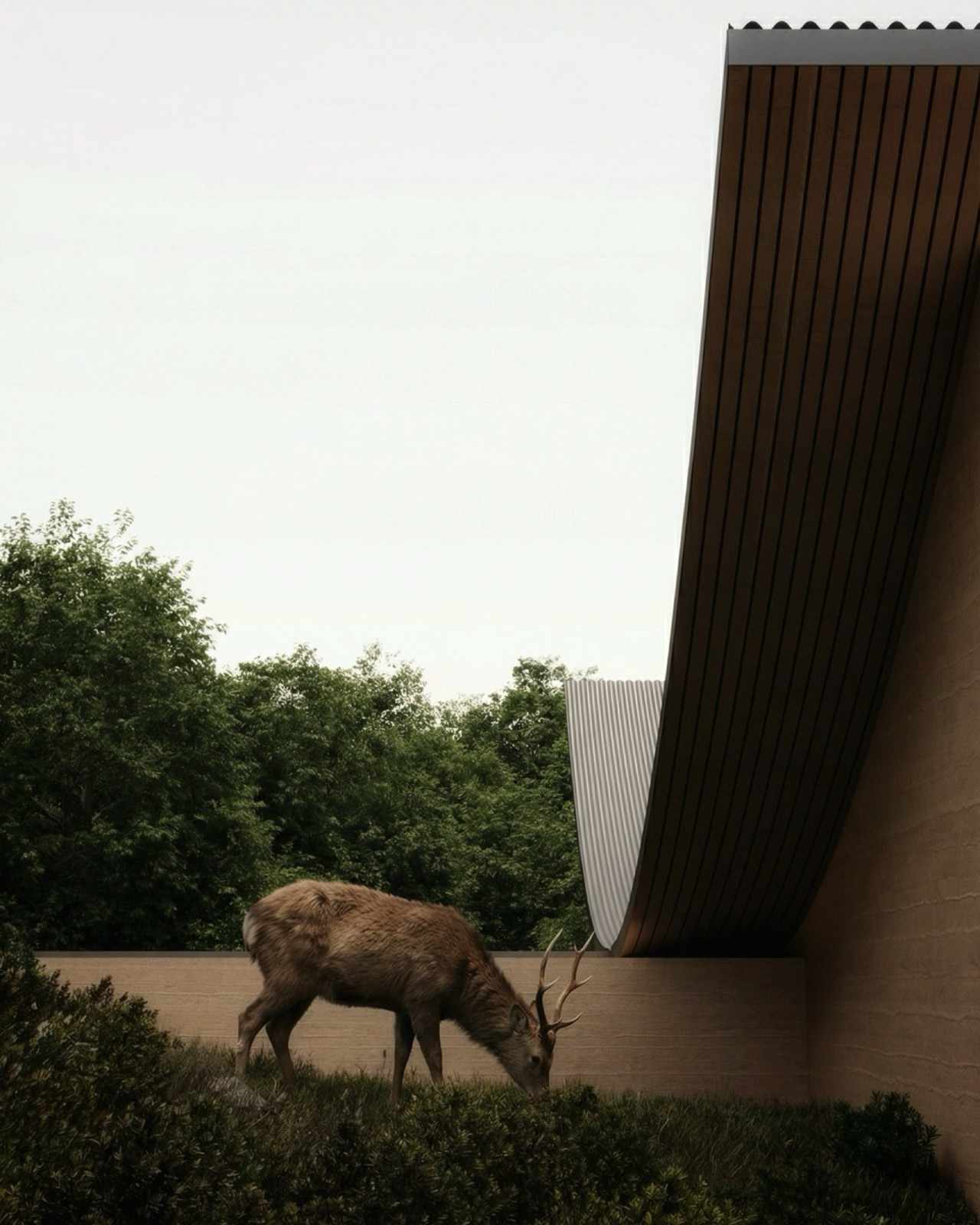 Vila ini menafsirkan ulang hunian sebagai topografi yang dapat dihuni dan tertanam di dalam alam. Bangunan ini ditandai oleh atap lebar yang melengkung dan dinding batu bertumpuk yang berada tenang di tepi hutan. Atap yang melayang di atas kolom-kolom ramping dan dinding kaca dari lantai hingga langit-langit membingkai pemandangan hutan yang tenang.
