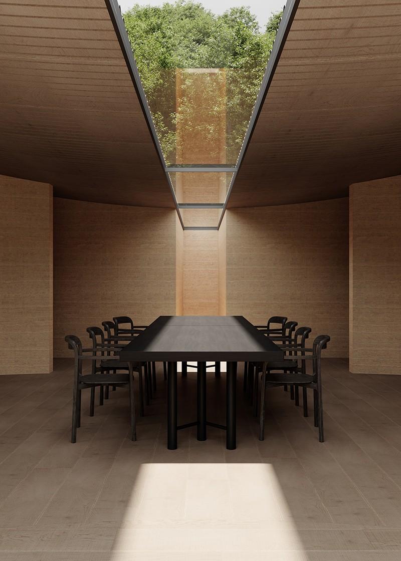 Skylight di atap juga menyalurkan cahaya jauh ke dalam interior dan jatuh tepat di atas meja makan komunal yang besar. Cahaya yang tersaring dari bukaan tersebut menciptakan pola bayangan lembut yang terus berubah dan menghidupkan ruang.