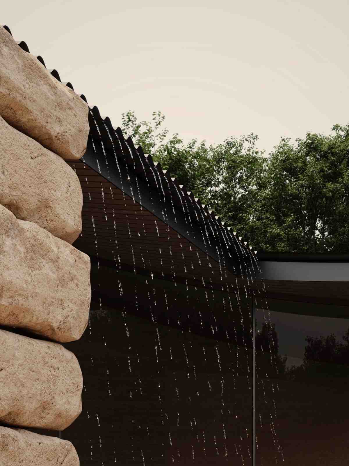 Air hujan diarahkan melintasi teras-teras luar, menegaskan kehadiran elemen air di seluruh ruang. sumbu air di tengah bangunan memanjang ke luar dalam bentuk kolam renang linear, sementara area duduk yang sedikit lebih rendah menghubungkan ruang dengan lanskap sekitarnya.