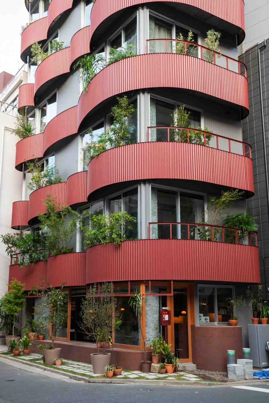 Panel baja bergelombang berwarna merah karat melengkung mengitari sebuah hotel sempit berisi 14 kamar di pusat Tokyo. Hotel ini dirancang oleh Kiyoaki Takeda Architects bersama Staple Studio untuk mencerminkan budaya lama kawasan tersebut yang dikenal dengan praktik berkebun di gang.