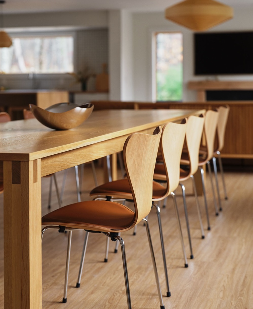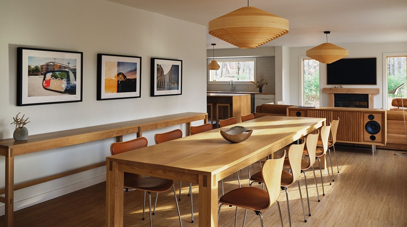 Sebagian besar furnitur di dalamnya berasal dari material dan finishing kayu alami, selaras dengan keseluruhan konsep hunian. Kursi dari Herman Miller serta Fritz Hansen dipadukan dengan meja dan lemari kabinet dari USM dan Cassina, menambah kesan yang mewah bagi pengunjung tanpa dapat mengalihkan perhatiannya dari pemandangan luar.