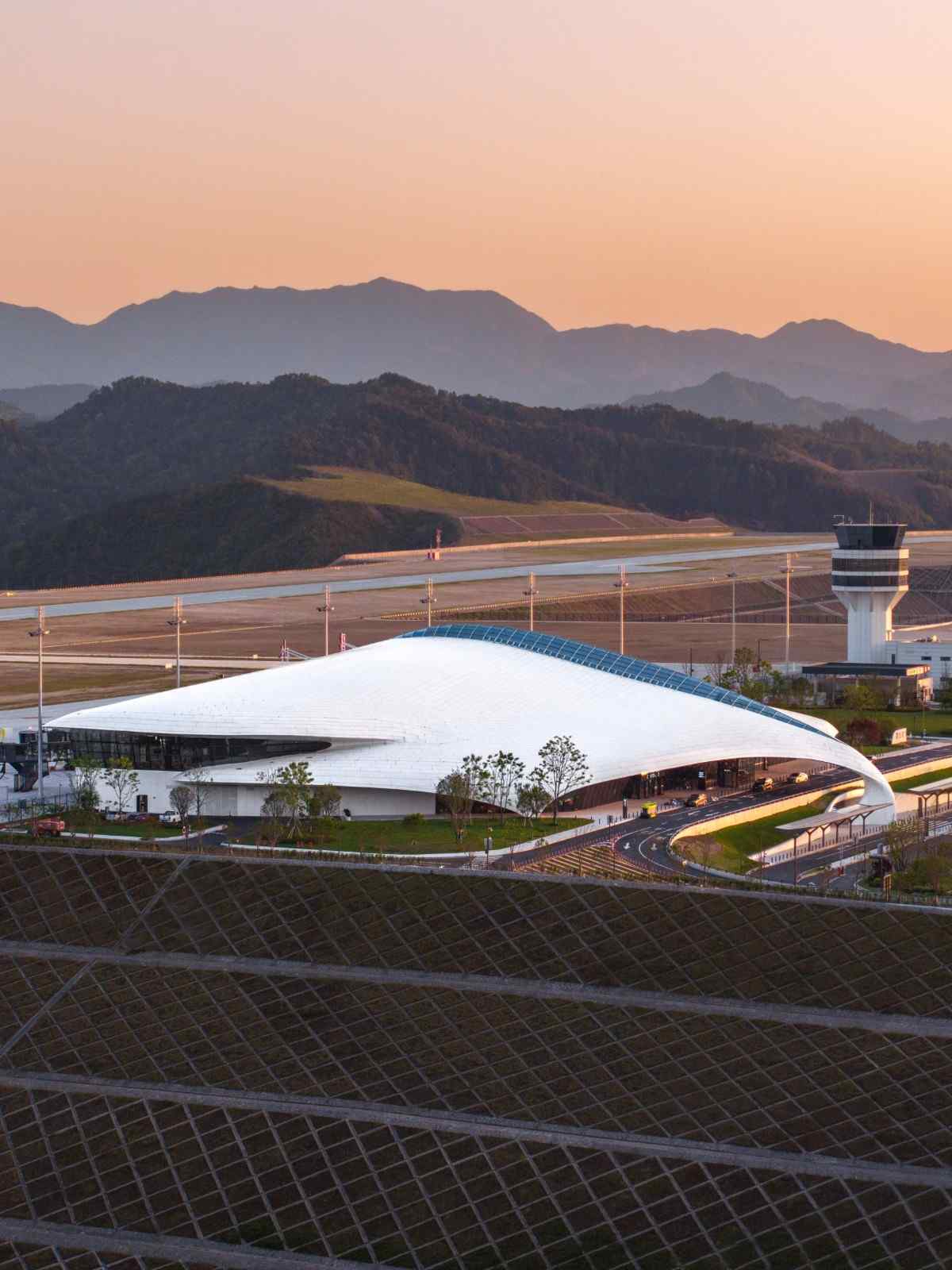 Studio tersebut menilai garis atap bangunan menghadirkan kesan seperti perbukitan yang tertutup kabut dan burung yang sedang melayang, sehingga arsitekturnya terasa sebagai bagian dari lanskap, bukan objek terpisah. Bandara satu setengah lantai ini sebenarnya mulai dirancang sejak 2008 dan baru selesai setelah proses selama 17 tahun.