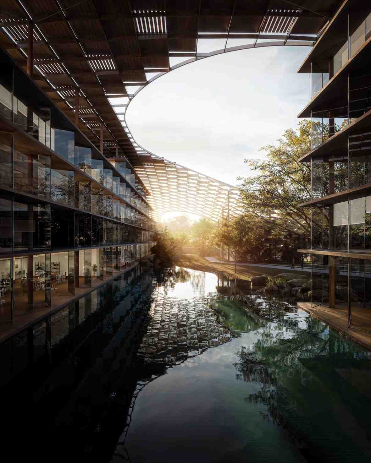 Permukaan kanopi tersebut dibentuk dari kombinasi panel persegi, panel fotovoltaik, planter, serta panel pergola yang menciptakan efek berlapis menyerupai gelombang.