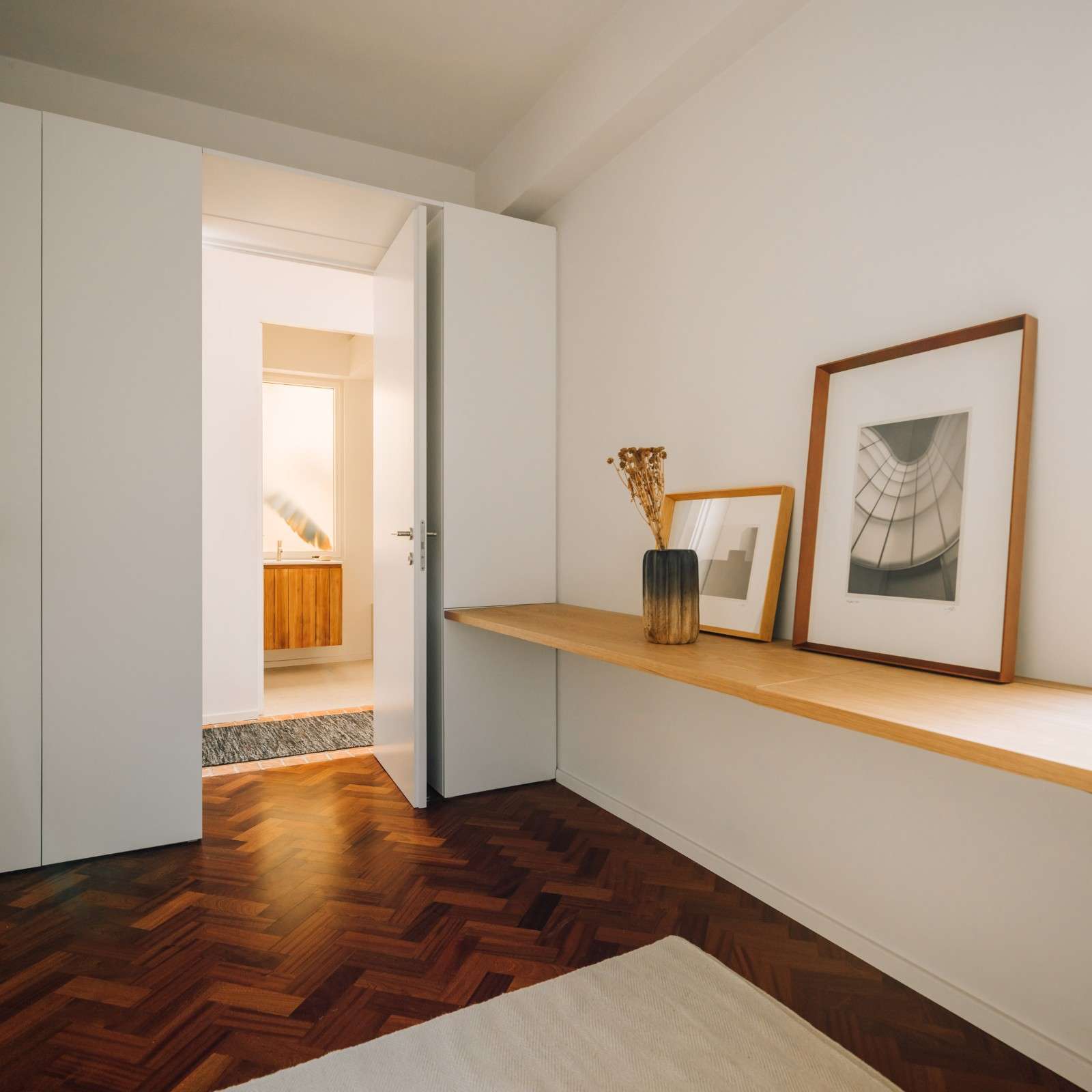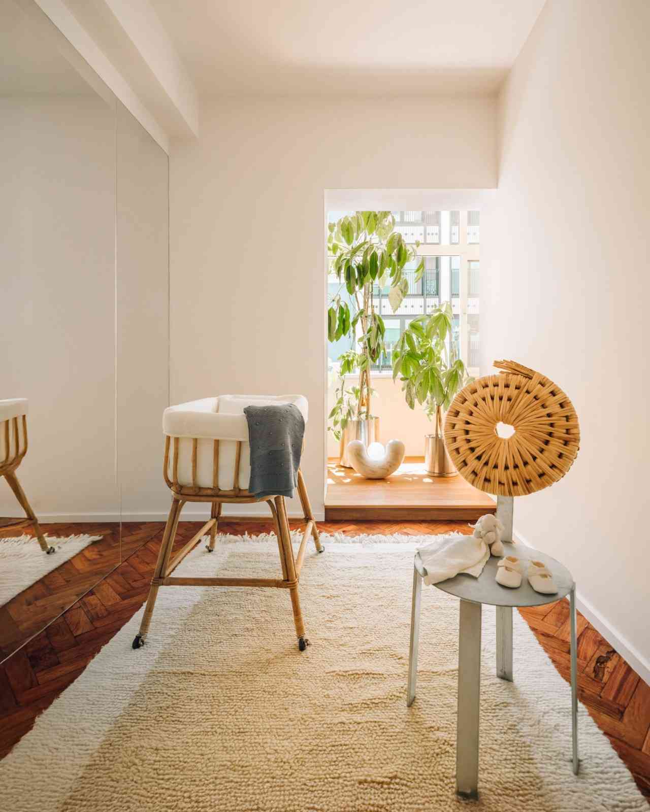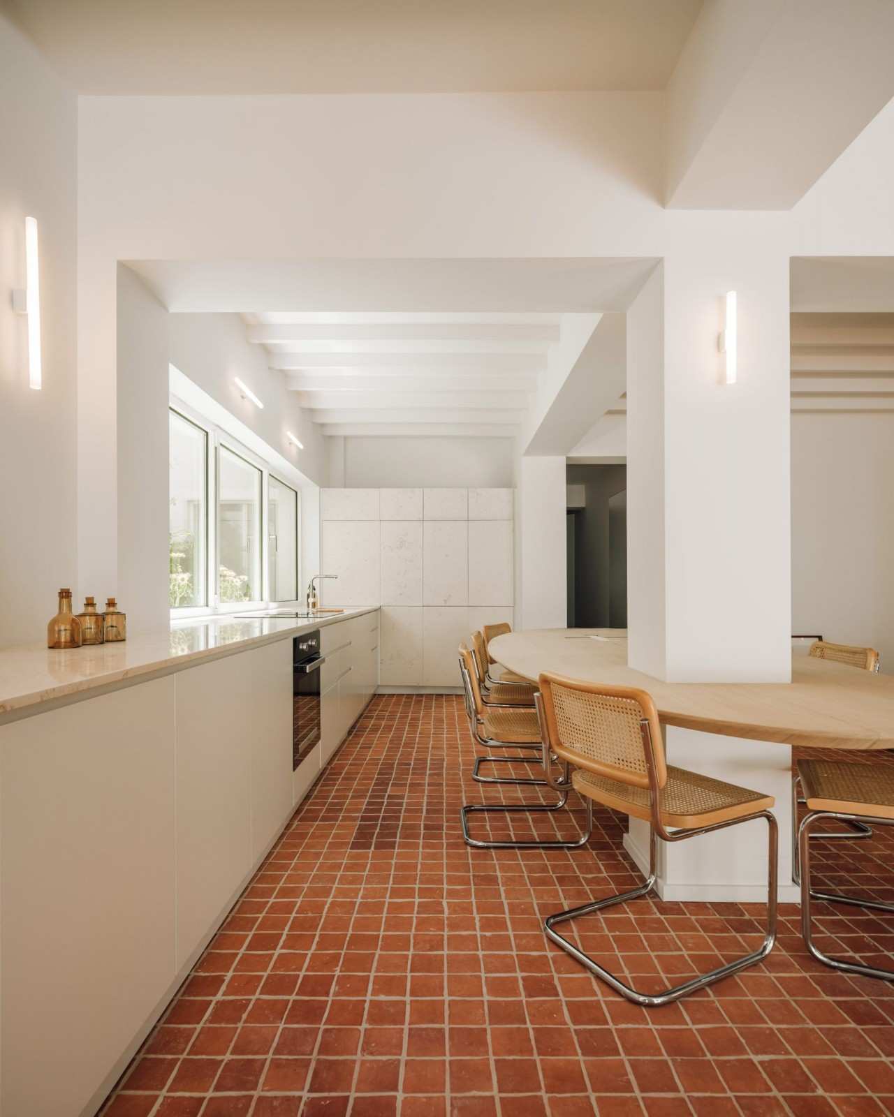 Alentejo menjadi sumber ubin terakota yang digunakan sebagai elemen utama interior. Dalam ruang keluarga berkonsep open-plan, studio menempatkan furnitur rendah dengan bentuk pahatan yang memberi sentuhan kontemporer di antara material yang lebih tradisional. Bavuso menyebut bahwa mereka memadukan karya desainer lokal, termasuk daybed rancangan Joana Vilaça, dengan objek yang lebih abstrak seperti kubus cermin untuk menghadirkan permainan visual tanpa mendominasi ruang.