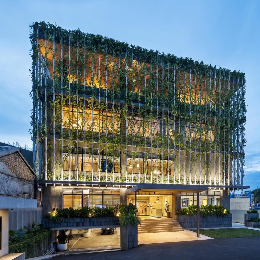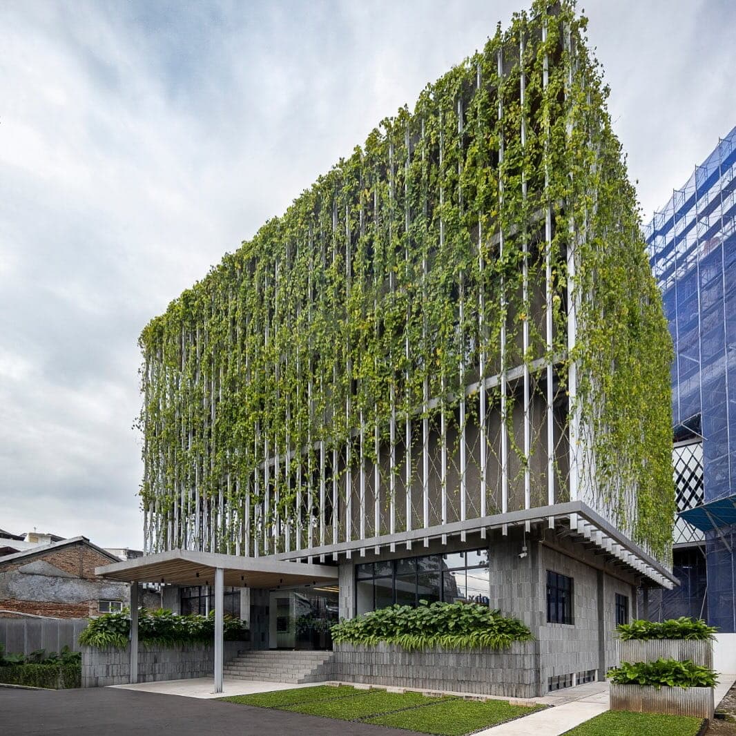 Bangunan ini merupakan hasil transformasi dari struktur lama yang sempat terbengkalai menjadi volume arsitektur hijau yang tampak “mengambang”. Dengan desain yang hadirkan elemen vegetasi dan pelindung dari sinar matahari, bangunan ini bawa suasana teduh bagi penggunanya sekaligus berikan pemandangan luar yang lebih segar dari hiruk pikuk Jakarta.