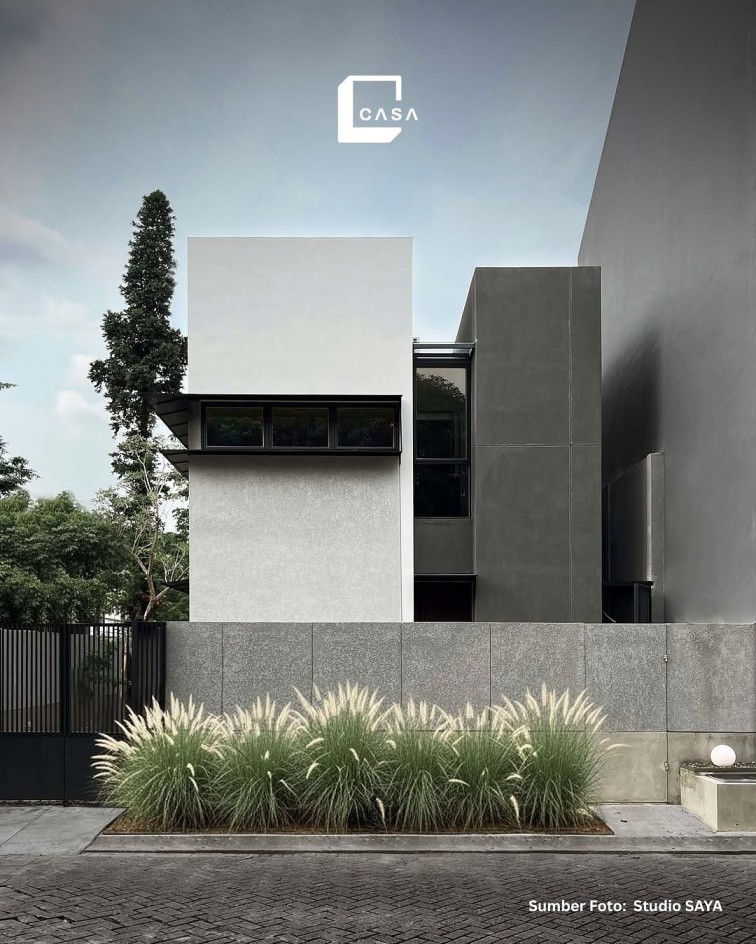 Model rumah minimalis 2 lantai tampak depan terbaru hasil rancangan Studio SAYA ini menampilkan desain fasad yang simpel dengan bentuk kubikal yang tegas. Perpaduan warna-warna netral seperti putih, abu-abu, dan hitam menciptakan tampilan minimalis modern yang clean dan elegan.