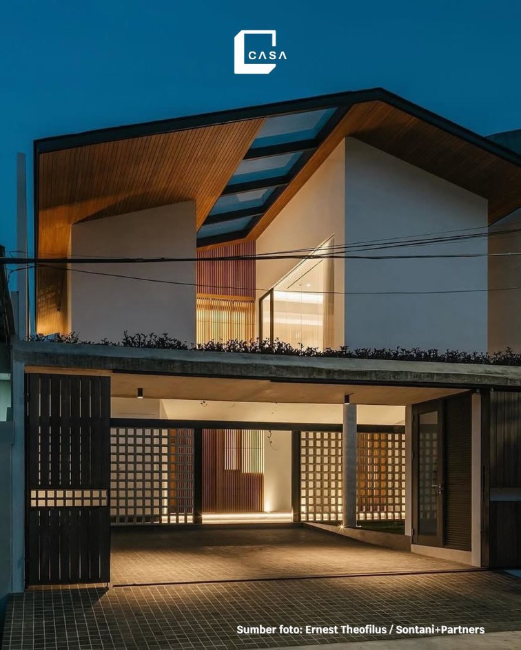 4. Model Rumah Minimalis Modern 2 Lantai dengan Aksen Kayu dan Skylight