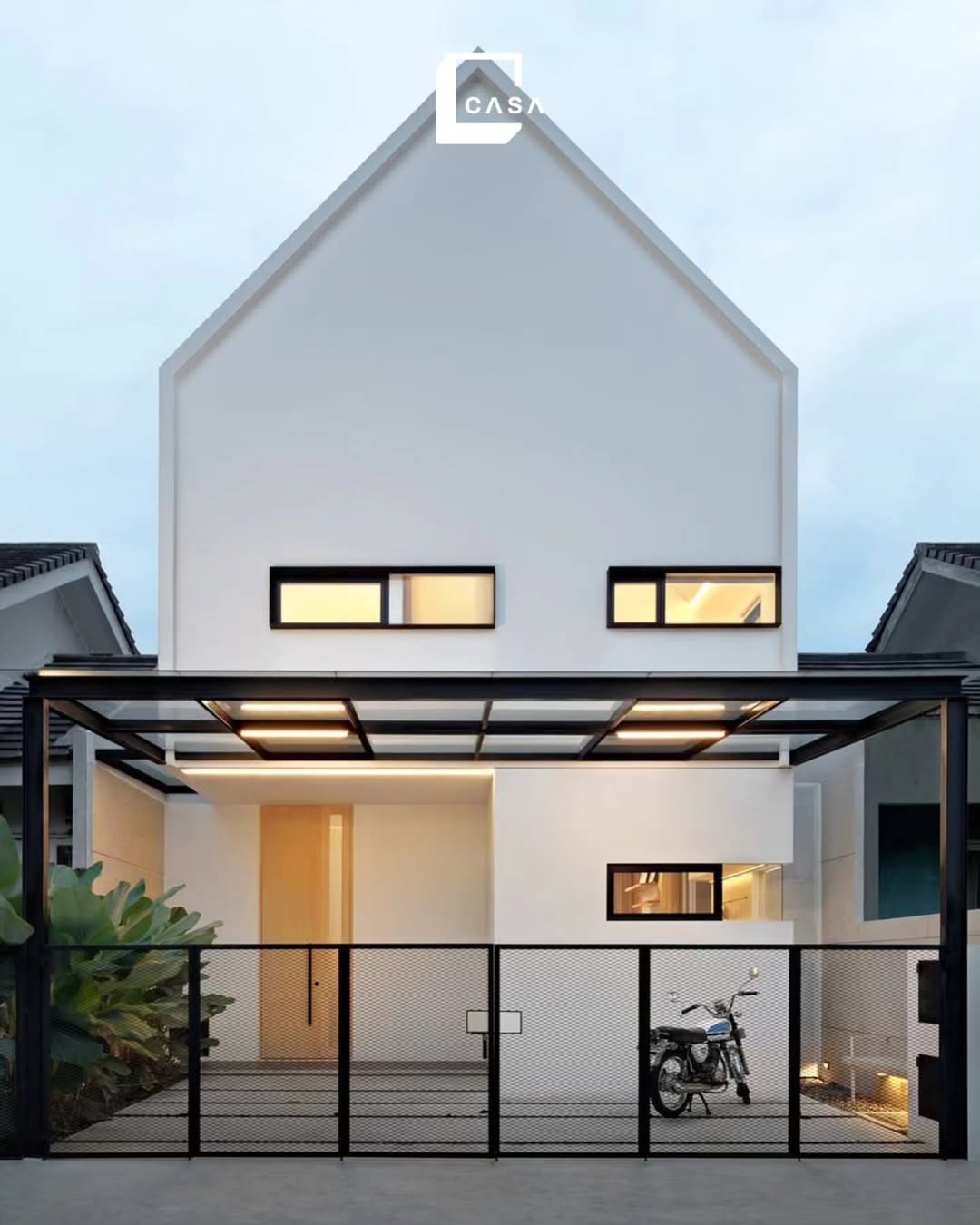 Tampak depan rumah minimalis 2 lantai ini menampilkan desain fasad yang simple dengan dominasi warna putih yang clean dan elegan. Model atap pelana menghadirkan siluet unik yang semakin memperkuat tampilan minimalis modern pada hunian.