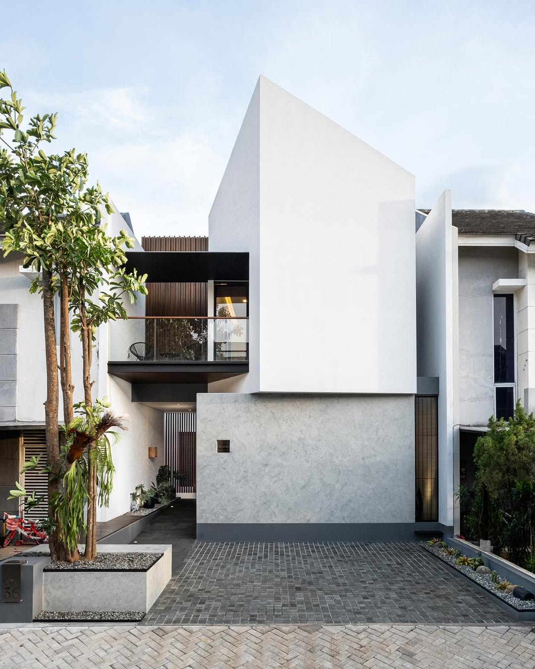 Model rumah minimalis 2 lantai hasil rancangan Kara Architecture ini memiliki tampilan fasad yang unik dengan bentuk geometris yang tegas. Fasad hunian ini didominasi oleh warna putih yang dipadukan dengan warna abu-abu dan aksen hitam, menciptakan tampilan minimalis modern yang clean dan elegan.