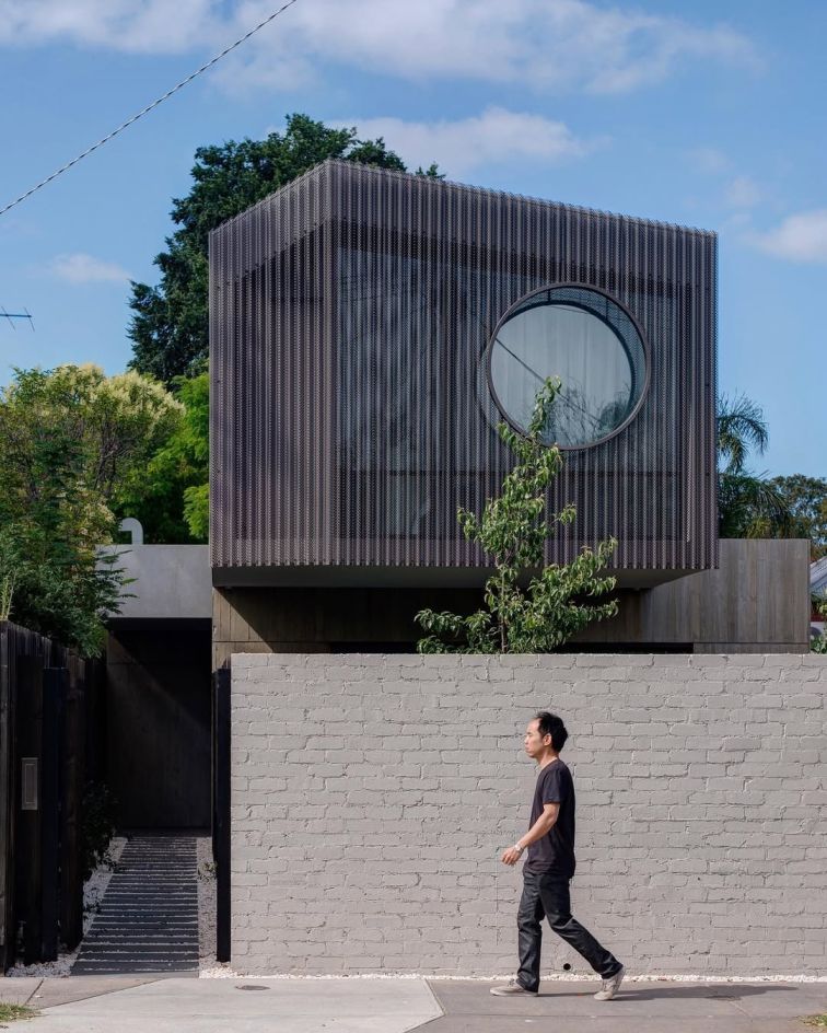 Tampak depan hunian hasil rancangan Craig Tan Architects ini menampilan desain minimalis kontemporer dengan fasad secondary skin yang kuat secara visual. Penggunaan secondary skin pada paparan sinar matahari sekaligus menjaga privasi penghuni. Kehadiran jendela bulat berukuran besar menambah daya tarik visual pada tampilan depan rumah. Kombinasi penggunaan warna-warna netral pada keseluruhan desain memberikan tampilan depan rumah minimalis kontemporer yang elegan, clean, dan tidak berlebihan.