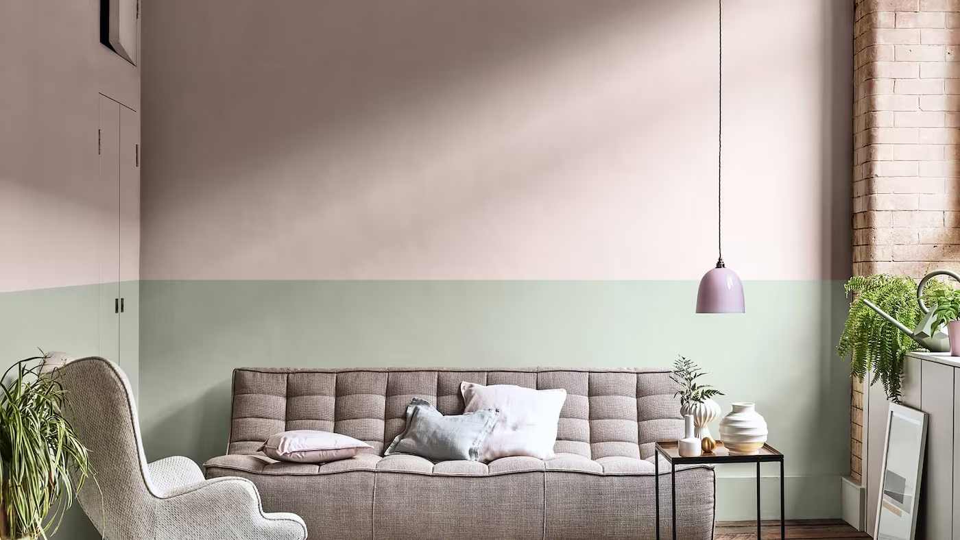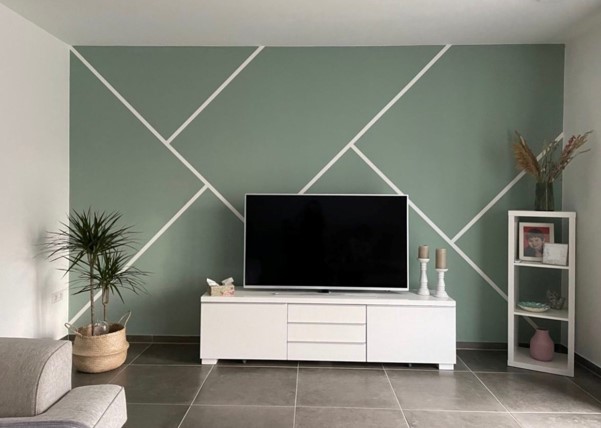 Desain garis diagonal merupakan salah satu inspirasi paling sederhana namun memiliki dampak visual yang kuat dalam interior. Kombinasi dua warna yang dipisahkan oleh garis miring mampu menciptakan kesan dinamis dan modern, sekaligus memberikan ilusi ruang yang lebih luas. Pola ini sangat cocok diterapkan pada ruang tamu atau kamar tidur yang ingin menampilkan nuansa energik namun tetap elegan.