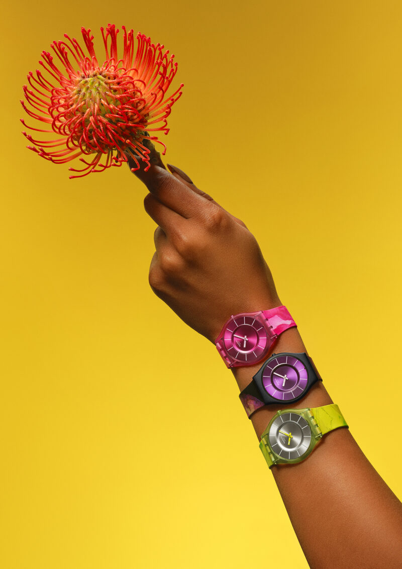 Swatch juga menghadirkan lini SKIN, koleksi jam tangan dengan desain tipis yang terasa ringan di pergelangan tangan. Tampilan minimalisnya memberikan kesan modern dan fleksibel, sehingga koleksi ini terus berkembang mengikuti perubahan gaya, sekaligus mempertahankan karakter sederhana yang fungsional.