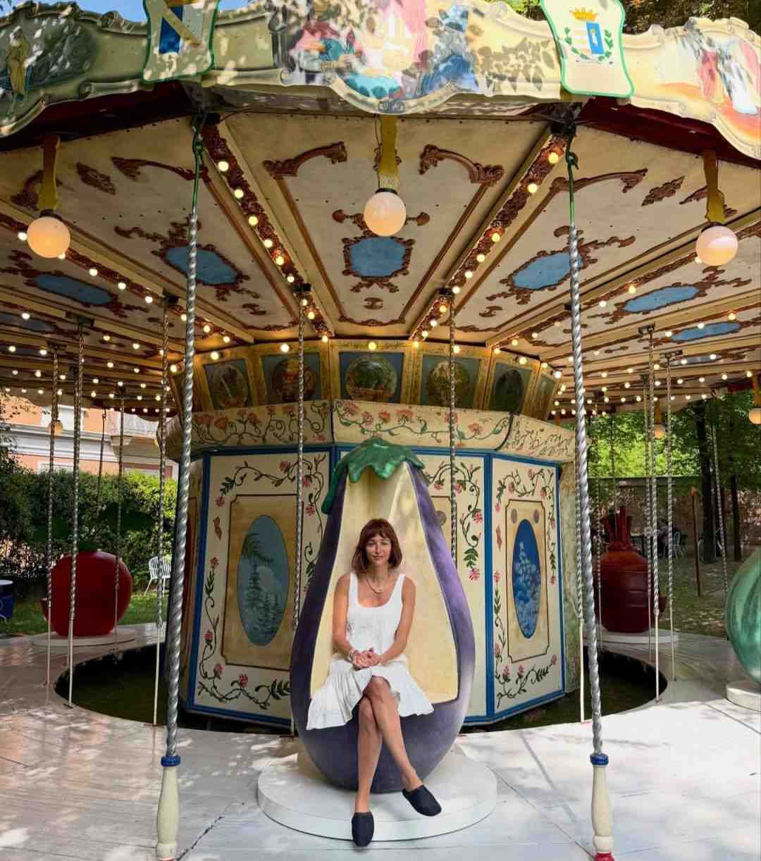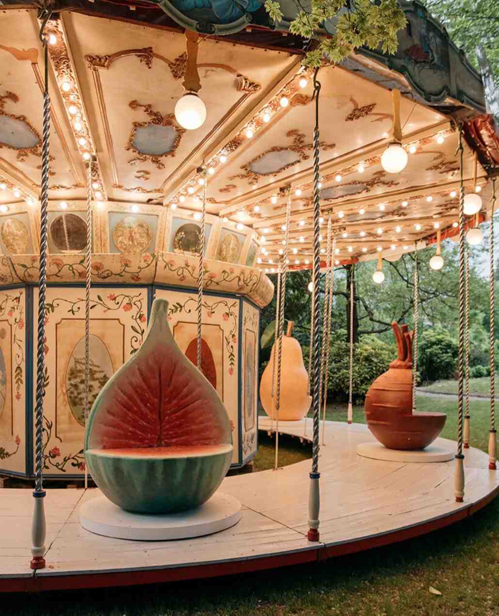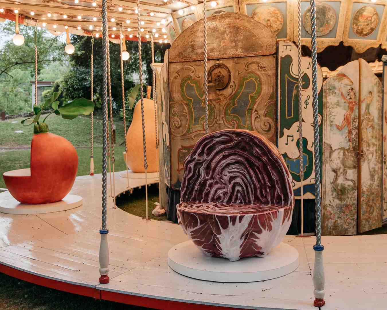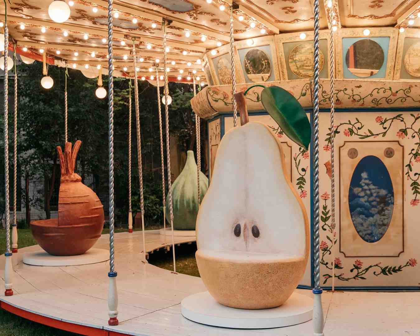 Berlangsung pada 20-24 April 2026, instalasi berbentuk komidi putar antik tersebut diadaptasi dari model langka akhir abad ke-18. Alih-alih kuda, elemen utamanya diganti dengan buah dan sayuran berukuran besar. Perubahan ini menciptakan pengalaman visual yang langsung terasa, di mana objek sehari-hari diperbesar, dipindahkan konteksnya, dan dibuat bergerak, sehingga struktur yang identik dengan masa kecil berubah menjadi semacam panggung visual untuk orang dewasa.