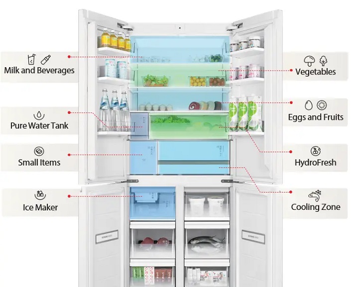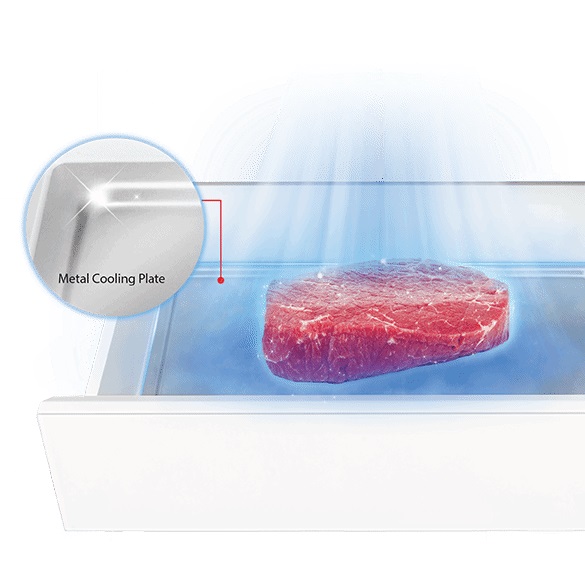 Pada kulkas multidoor terbaru seperti Toshiba Japandi, sistem penyimpanan sudah dirancang lebih spesifik. Setiap jenis bahan makanan punya zona masing-masing agar lebih tahan lama dan tetap aman dikonsumsi. Sementara daging dan ikan bisa disimpan di rak cooling zone sebagai laci khusus dengan pengaturan suhu presisi yang dirancang untuk menjaga kualitas protein tetap optimal.