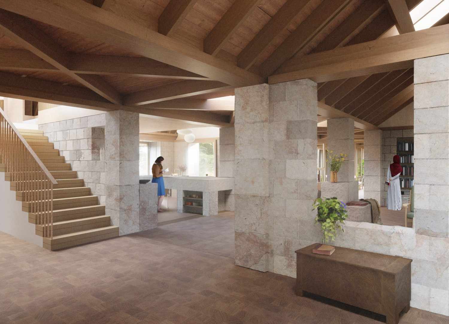 Visual desain menunjukkan susunan volume berlapis plester putih dengan atap miring berlapis genteng yang dilengkapi skylight. Sementara itu, bagian interior akan memakai dinding blok batu, struktur atap kayu terekspos, panel kayu, serta jendela besar yang menghadap taman rancangan J&L Gibbons.